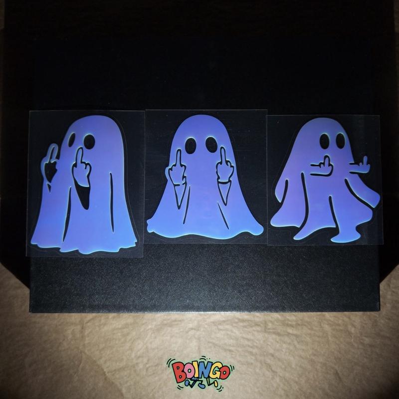 Three mischievous ghosts bring a fun, rebellious vibe to your style. Their cheeky middle finger gesture is a humorous way to show off your personality, making these decals a unique and playful accessory.