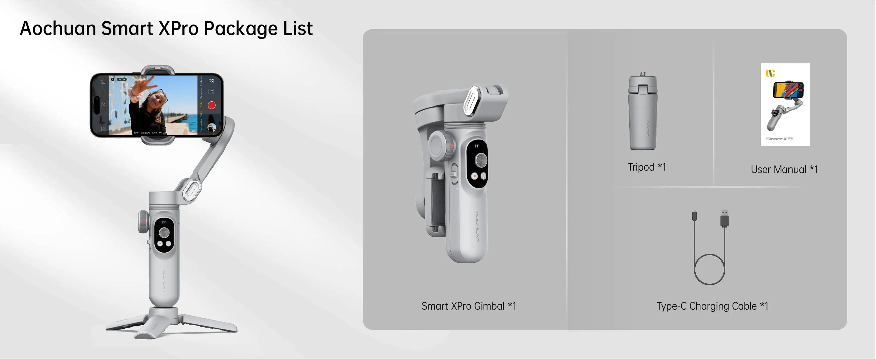 AOCHUAN SMART X Pro Gimbal Packing List and Support:1 x AOCHUAN SMART X Pro Gimbal(Grey model)(cell phone is not included),1 x Tripod,1 x USB-C Charging Cable,1 x User's Manual(Chinese may not be supported). When you have problems with the AOCHUAN Mobile Gimbal Stabilizer, you can contact our customer support team to help you. Please contact us directly on for a quick solution to your problem.