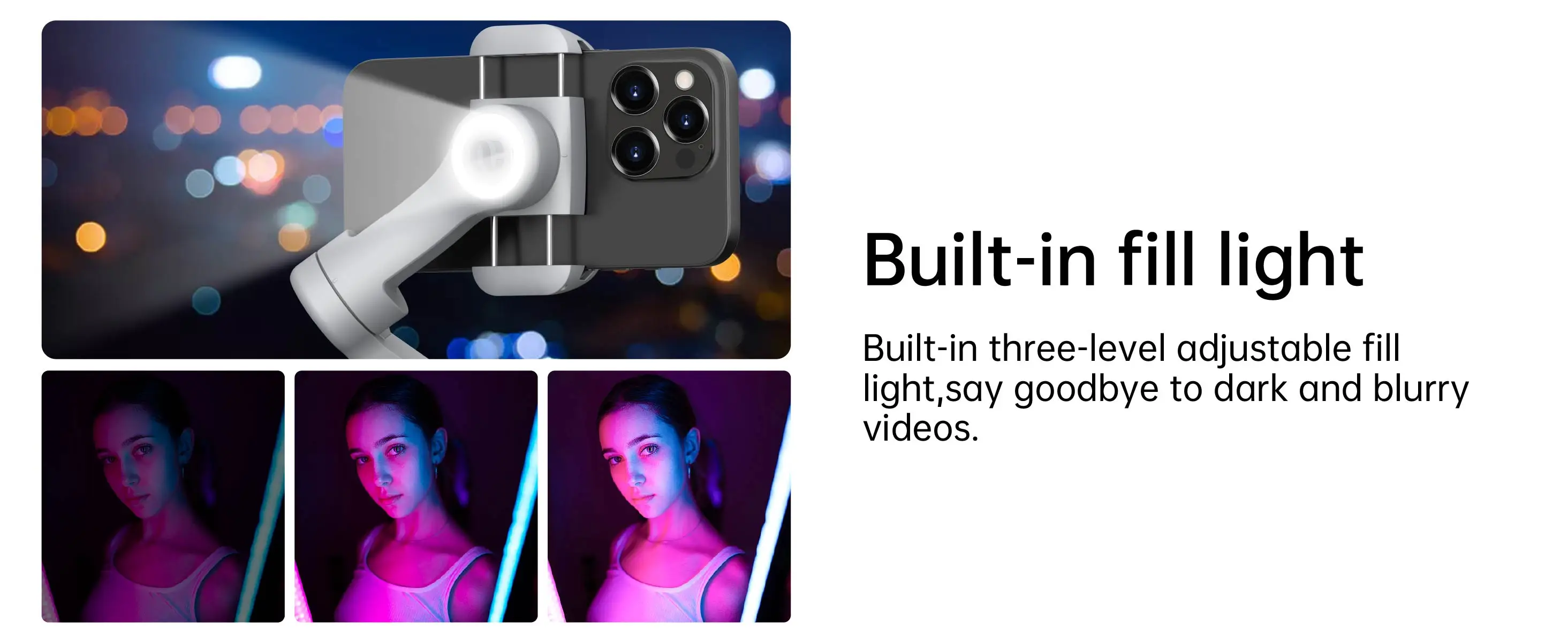 Shine your beauty with our integrated LED fill light. The Smart X Pro gimbal stabilizer with built-in video light and power button lights you up with three adjustable brightness levels. The LED fill light can illuminate up to 6000lux with 3 levels of brightness up to 5500k CCT. Even in dark lighting scenarios, nighttime shots are just as good.